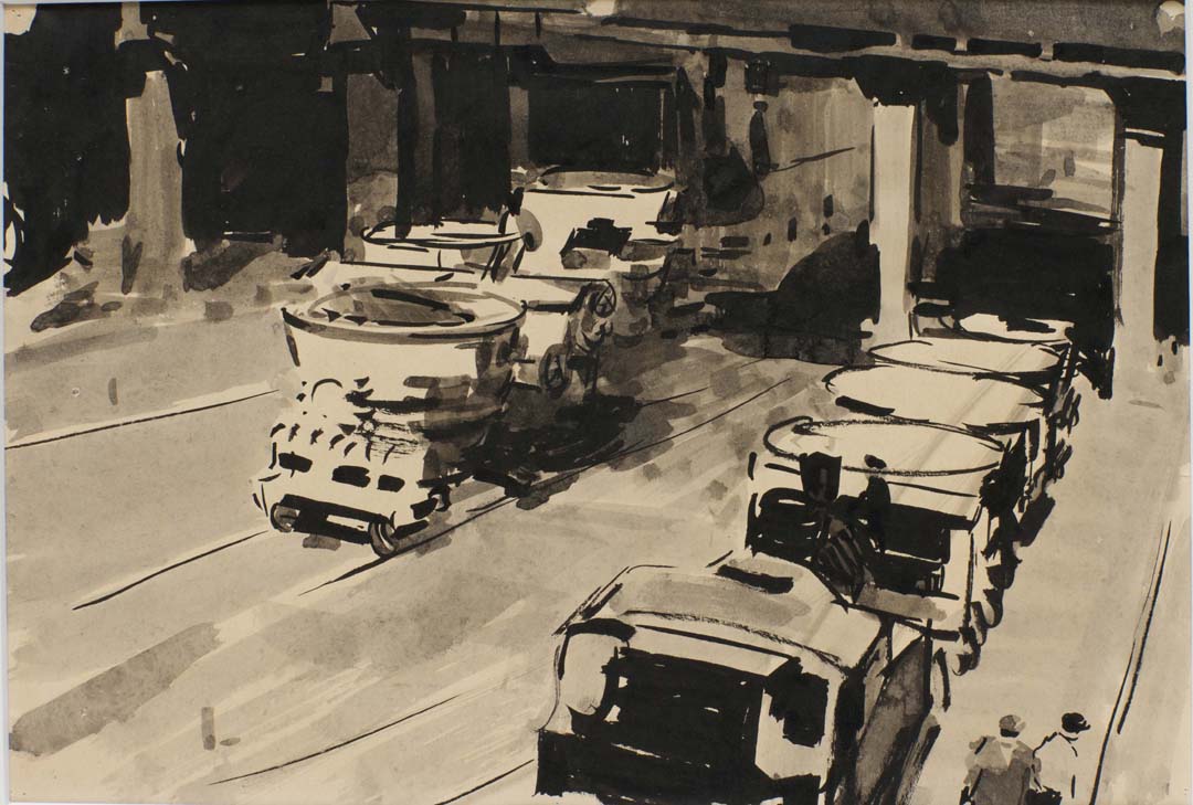 Interior court of Metallurgical Plant, Nizhny Tagil, 1958. Brush and ink on paper, 8 5/8 x 12 1/2 inches