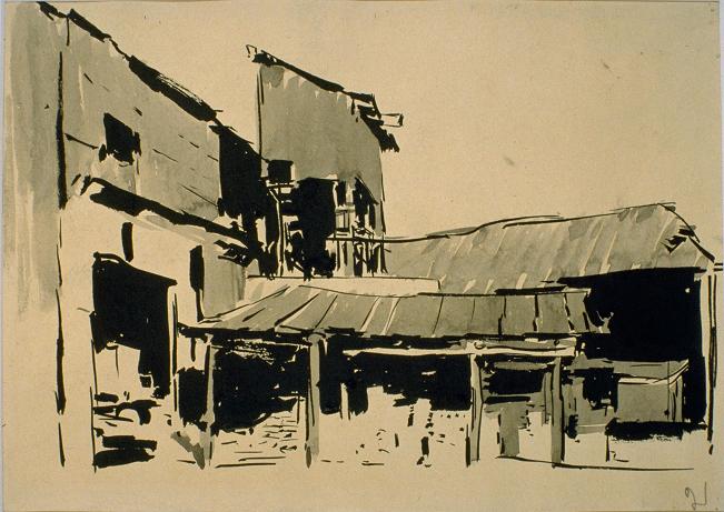 The Yard at an Old Plant, Nizhny Tagil, 1958. Ink on paper, 7 3/4 x 11 inches // 16 1/4  x 20 1/4 inches framed dimensions
