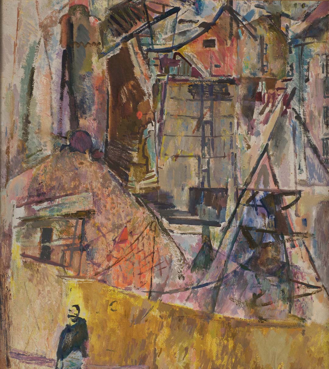 At the Construction Site, Leningrad, 1965. Oil on board, 29 1/2 x 26 1/2 inches // 41 x 37 inches framed dimensions