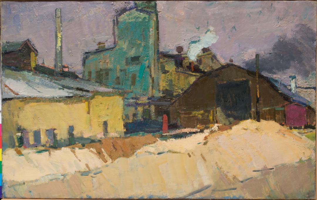 Lithopone Workshop, Urals. 1958–59. Oil on canvas, 24 3/4 x 39 inches