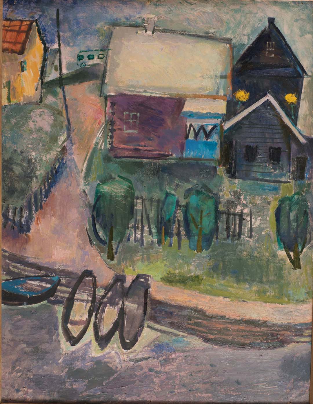 Boats at the River Bank, Staraya Ladoga, 1962. Oil on board, 27 1/8 x 20 3/4