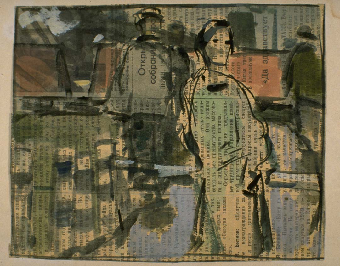 Untitled, from the series Railway Pointer, Leningrad, 1958–63. Ink, watercolor, and gouache on newspaper, 6 1/4 x 7 3/4 inches